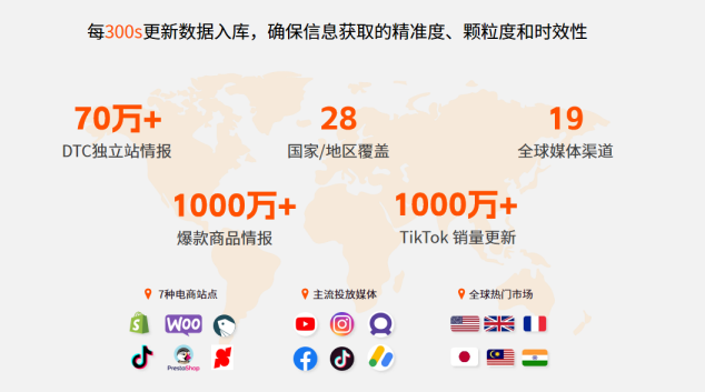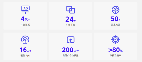 全链路数据覆盖:构建了覆盖全球50多个国家和地区、100多个流量平台的营销大数据网络,数据类型丰富,包括广告素材、商品信息、移动应用数据等。