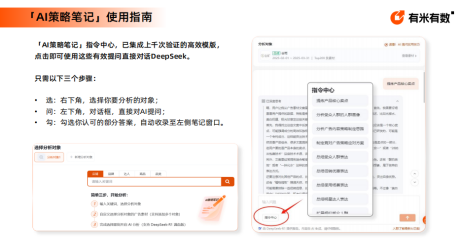 借助内置的 AI 策略笔记指令中心,可直接调用上千次验证的高效模板,通过 “选分析对象 – 输入问题 – 勾选优质答案” 三步,完成产品核心卖点提炼、受众人群画像分析、广告内容策略制定、竞对广告应对方案规划等操作,让数据分析更具指导性。
