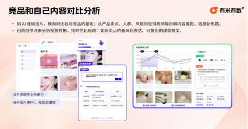 利用工具的竞品与自身内容对比功能,通过 AI 逐帧拉片,从产品卖点、目标人群、内容风格、促销机制等维度拆解差距。同时回溯竞品创作流程与投放数据,挖掘可复用的爆款框架,比如竞品的差异化卖点表达、促销活动设计思路,结合自身产品特性调整投放策略,提升广告转化效果。