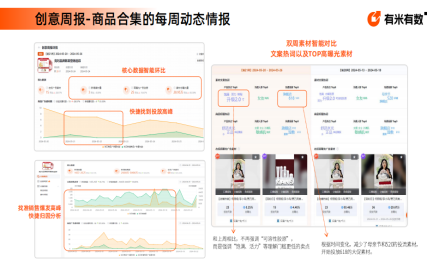 支持查看创意周报,获取商品合集每周动态情报,还能进行双周素材智能对比、核心数据环比分析,提炼文案热词与 TOP 高曝光素材。同时可精准定位投放高峰与销售爆发高峰,通过归因分析洞察素材策略变化,比如不同时段卖点侧重、大促素材投放节奏等,辅助优化广告素材方向。