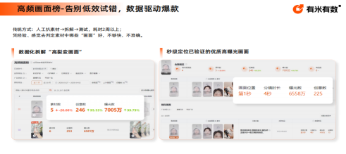 告别传统人工扒素材、凭经验判断的低效模式,该功能可秒级定位已验证的优质高曝光画面,数据化拆解 “高裂变画面”。能查看近 30 天高频画面的位置、分镜时长、曝光数、创意数等数据,明确优质片段的核心特征,降低素材试错成本,缩短爆款素材打造周期。