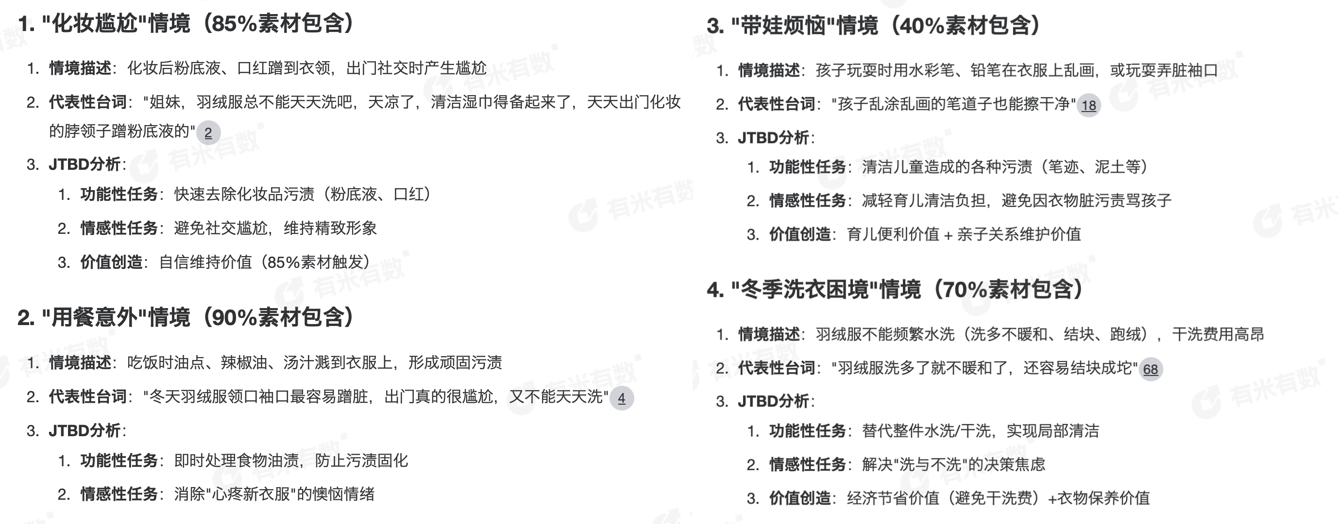 选项B:前期在抖音、小红书、微博等渠道建立用户认知,内容前半部分不讲价格,而是切入消费者的生活情境(Context),比如袖口的火锅油、宝宝的画笔印、衣领的粉底渍……找到一批卖点×情境×人群的高效组合,再有节奏地投入预算。