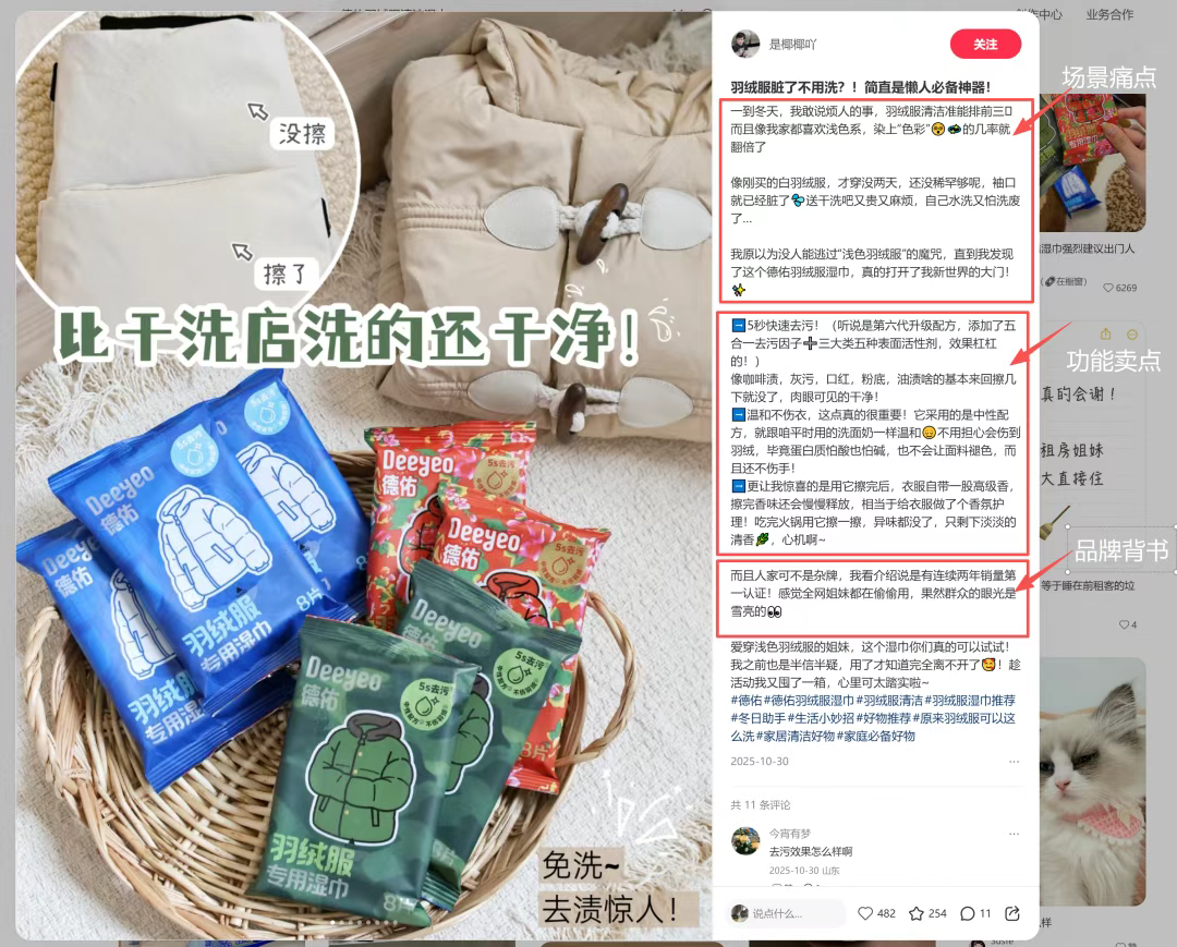 以下以 小红书博主@是椰椰吖 的图文为示例,内容通常涵盖情境痛点、产品功能卖点及品牌背书。