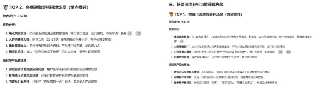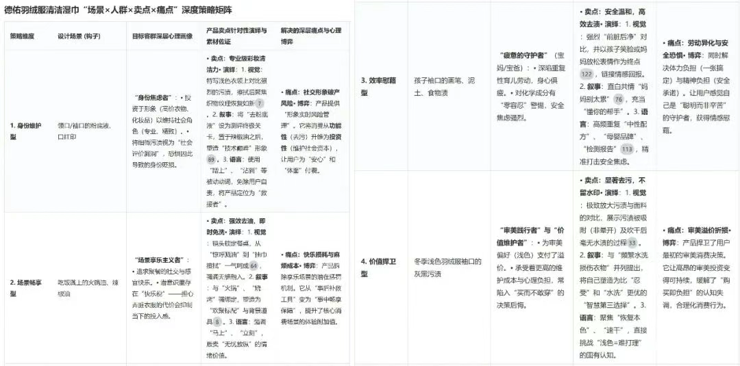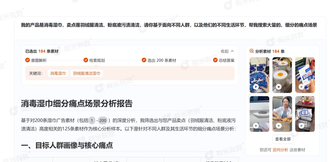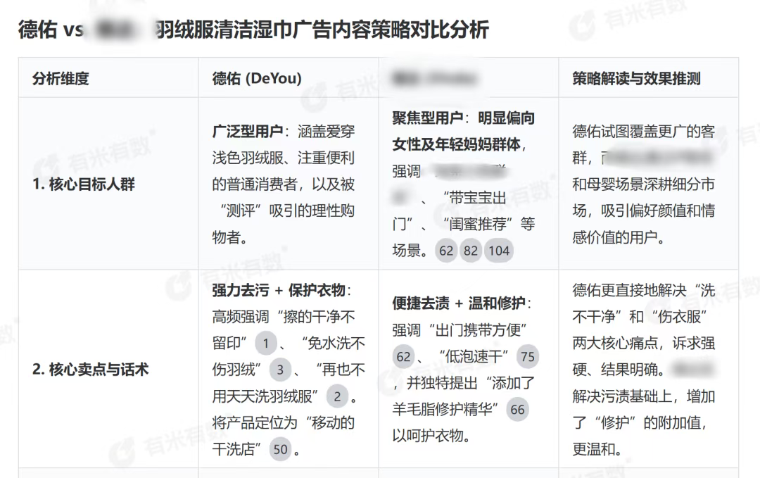 这里用有米有数「AI策略分析」策略探索,对德佑的素材进行分析总结,结果部分示例如下: