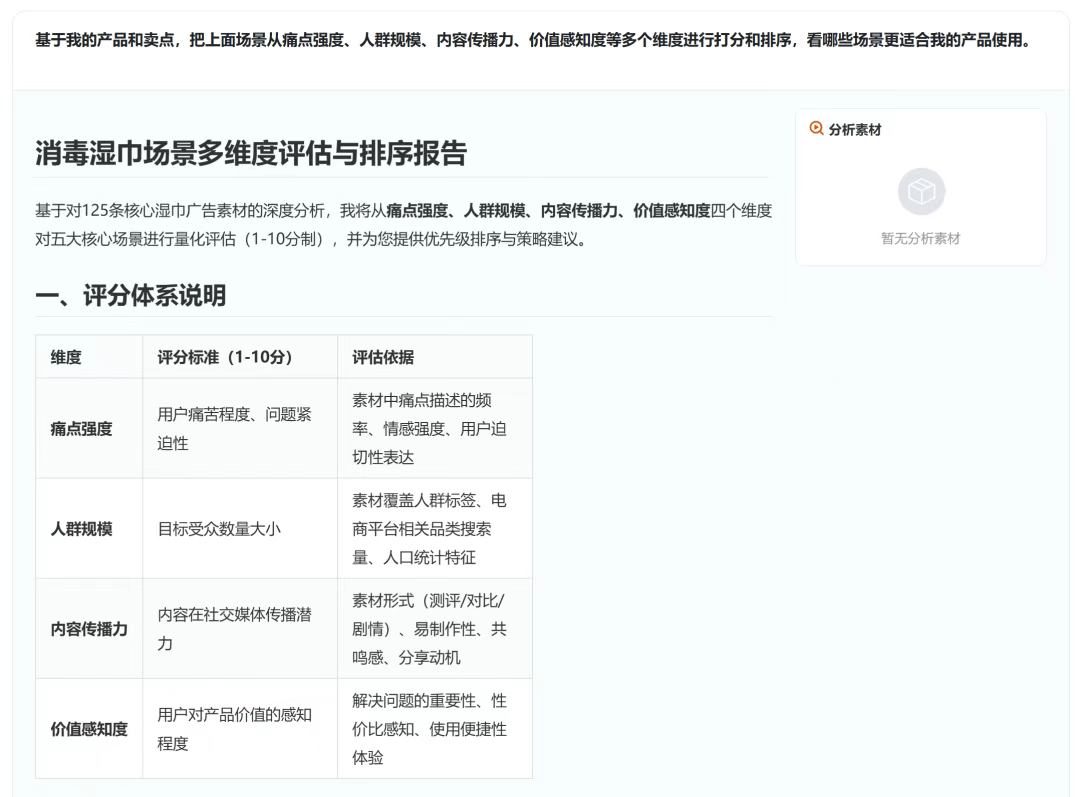 这里继续以上文消毒湿巾的搜索结果为例,让AI进一步进行打分和排序: