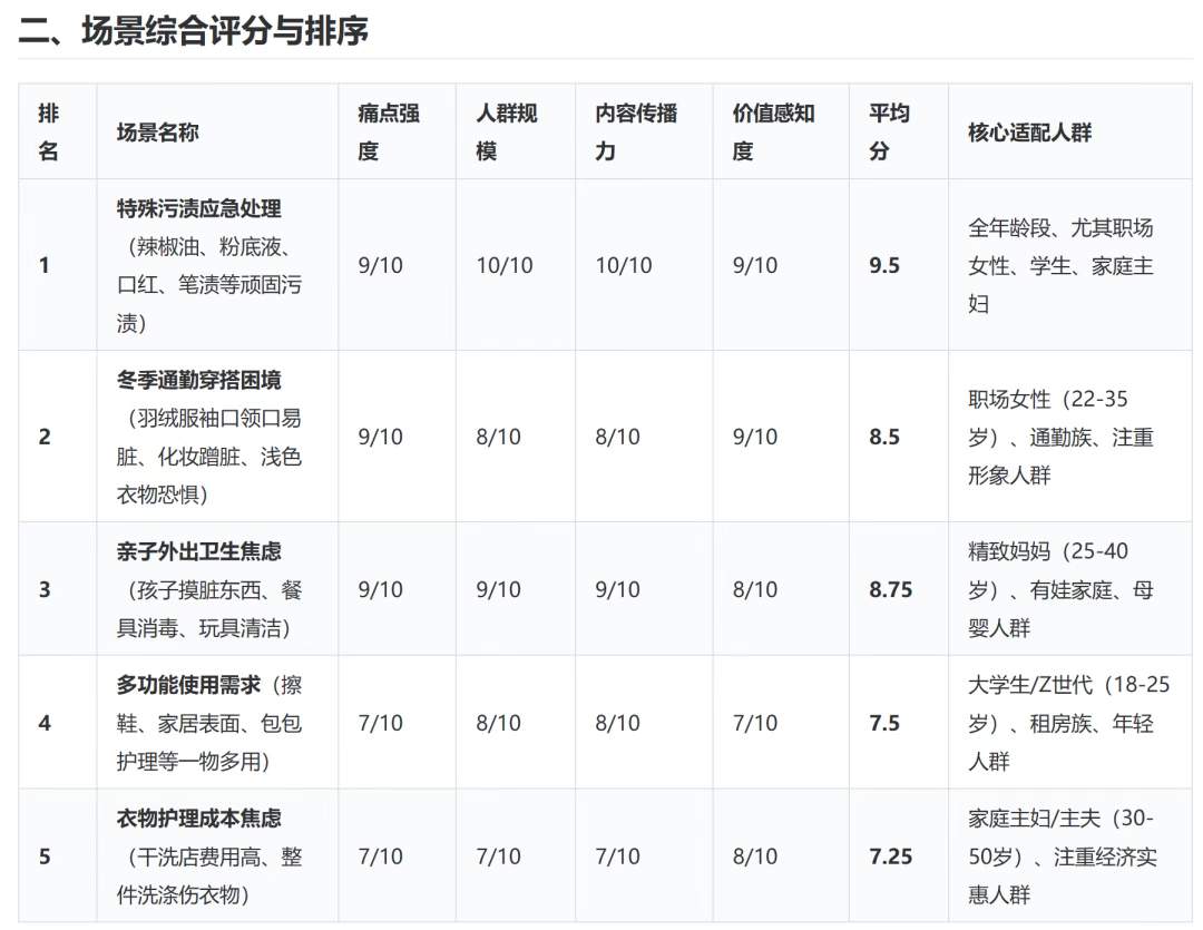 · 哪个情境覆盖人群最广、痛点最高频?(规模情境,你的“宝宝污渍”)——用来支撑主要销量。