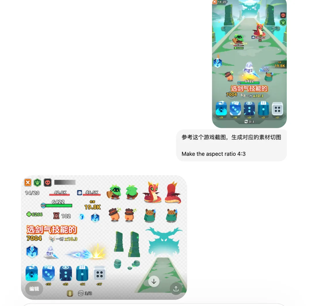 不用怀疑,拿切图来举例,上述这些技能对 AI 来说可太容易了。我拿《六六英雄》随便一个投放素材截图给 AI,就能无痛切图:每一层画面的元素都被归类放好,还提供了原截图没有的背面元素,甚至给到你 PNG 格式!
