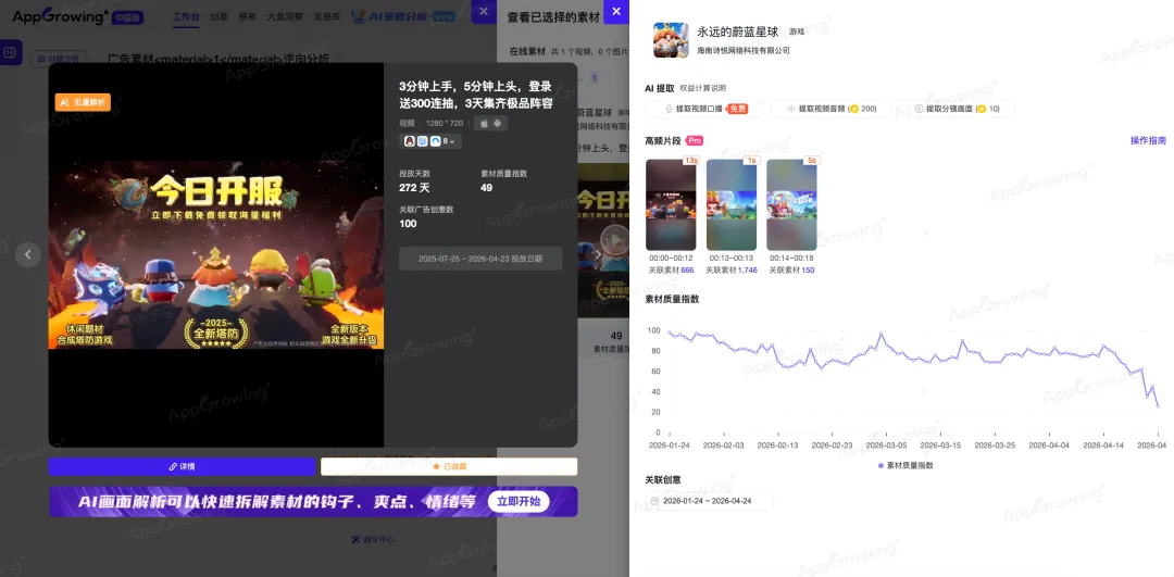 这个月开始,我们从 AppGrowing 收集的素材能明显看到,大部分游戏团队都开始用 AI 生成视频作为投放素材,无论是常年霸榜的《永远的蔚蓝星球》,还是上周刚开始大推的《六六英雄》。
