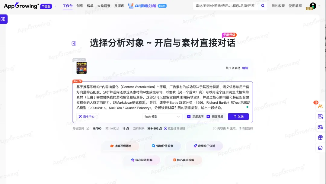最终 AI 会帮你逆向还原出提示词,并且分析出素材吸引到的玩家类型,方便你同时判断这个素材形式符合自家游戏近期的卖点。