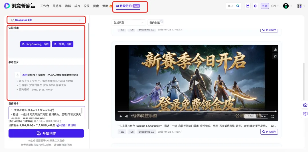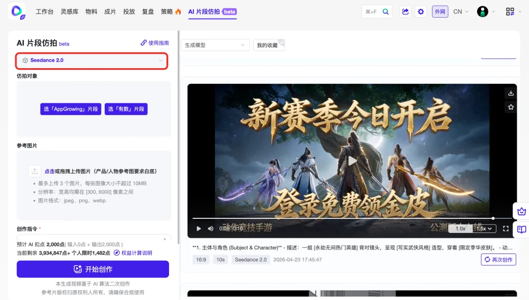 来!我们 AppGrowing 的 AI 仿拍不用排队,用也是一样的 Seedance 2.0 模型⬇️