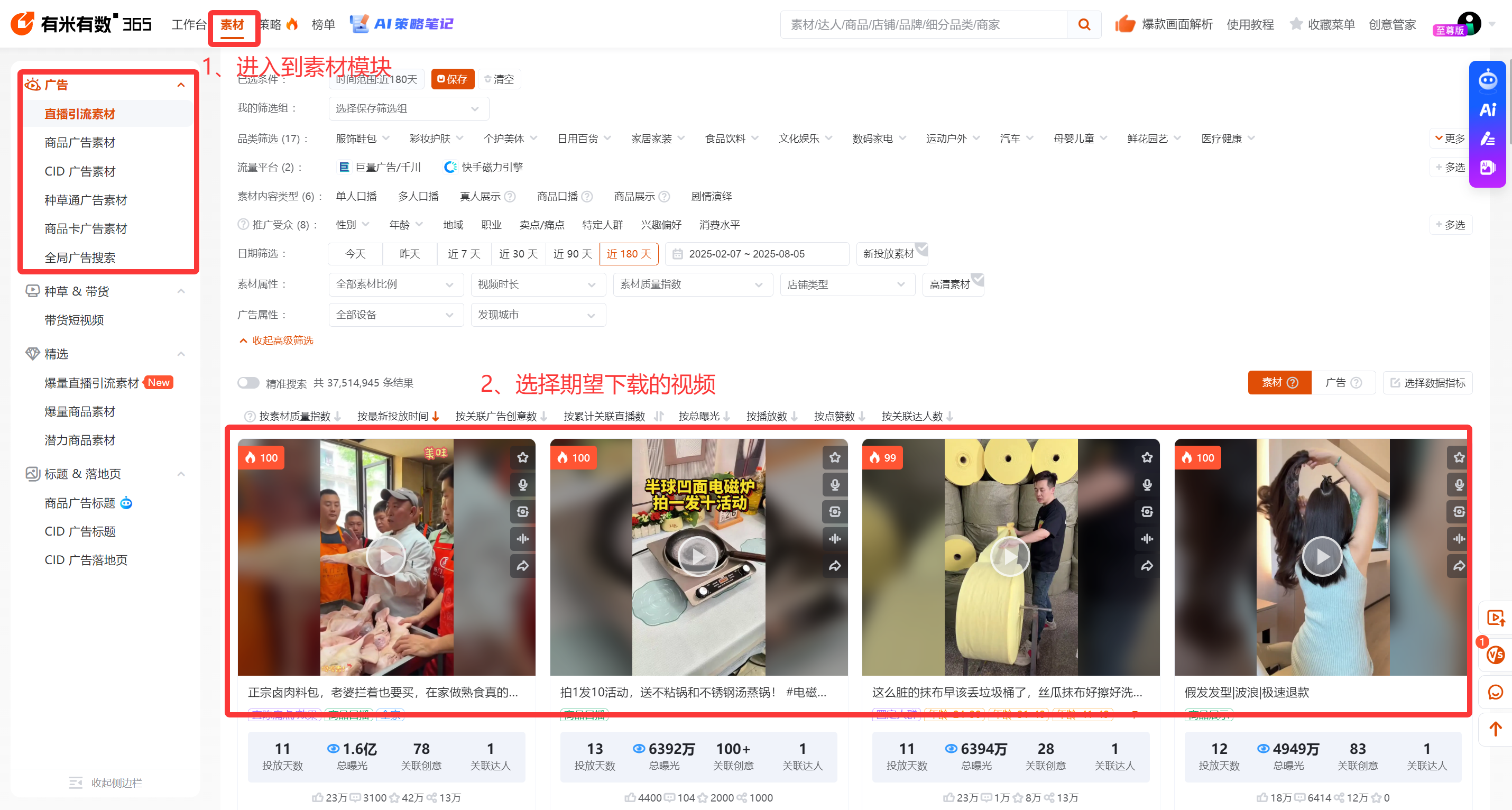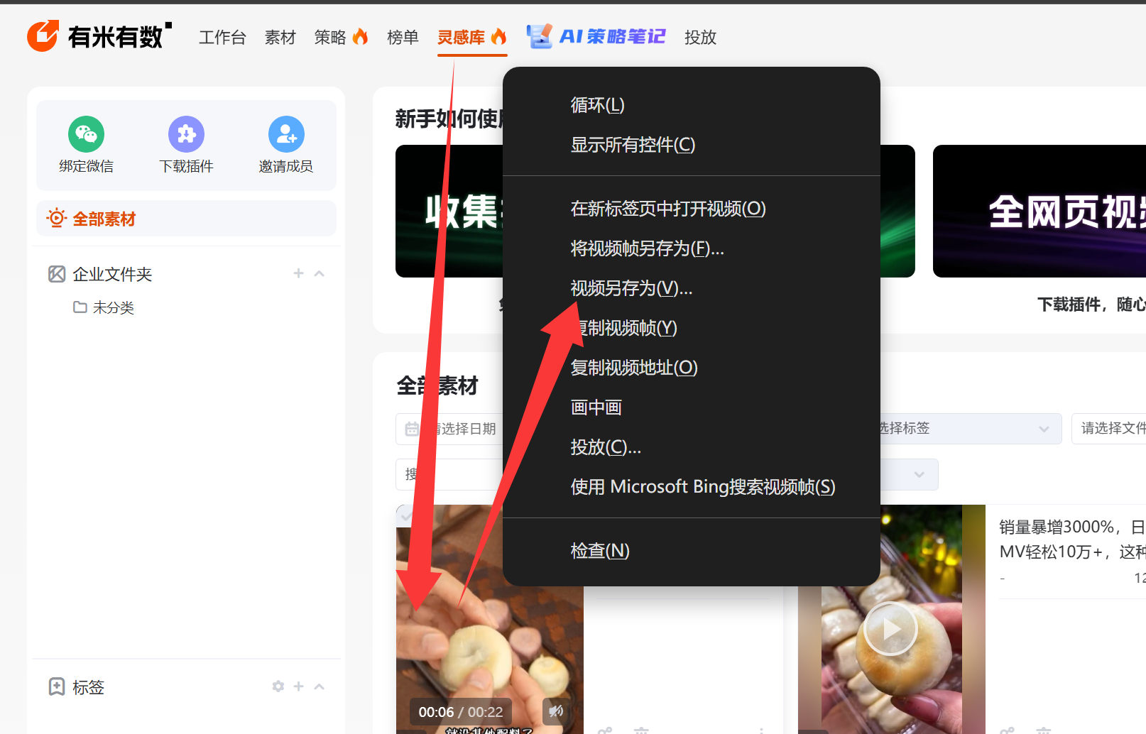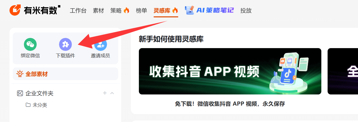 安装完成后,返回有米有数官网的素材板块。浏览或搜索您感兴趣的抖音千川视频,选中视频并点击“收集”按钮,将其添加到灵感库中。这步确保素材统一管理,方便后续批量操作。