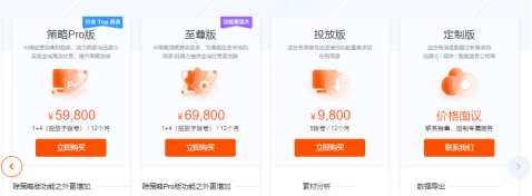| 策略Pro版 | 59,800元 | 1+4子账号 | 通过AI捕捉营销素材趋势,助力全域高效经营(行业Top首选)。 |