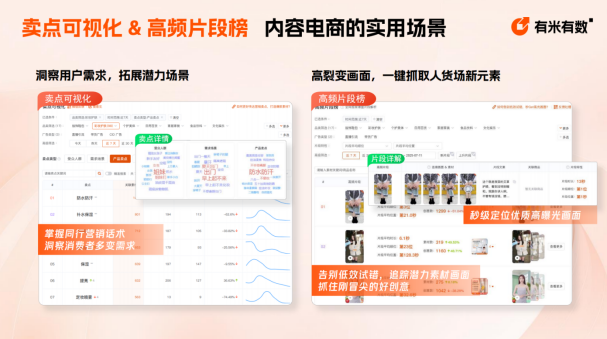 有米有数的 “卖点可视化”功能,能通过AI自动解析海量素材。以美妆品类为例,该功能通过自然语言处理技术解析2000+条爆量素材,自动提取出”成分安全”、”敏感肌适用”等核心卖点,并生成可视化热力图。测试数据显示,使用该功能后,素材测试通过率提升37%,平均创意周期缩短2.3天。