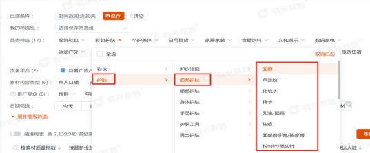 3.数据颗粒度:有米有数支持四级分类(行业-品类-细分品类-具体产品),支持素材按价格利益、人群圈定等8种套路标签精准筛选。其AI策略笔记功能可通过对话式交互生成落地脚本,将数据分析到策略执行的路径缩短60%。
