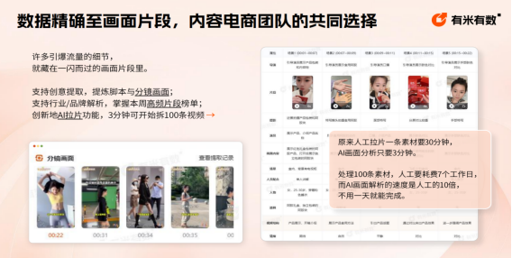 有米有数的”直播引流素材分析”功能追踪直播间流量来源素材,识别高转化画面片段。某食品品牌应用该功能后,直播素材的CTR提升18%,千次曝光成本降低12%。