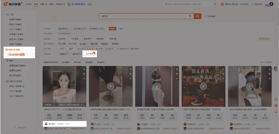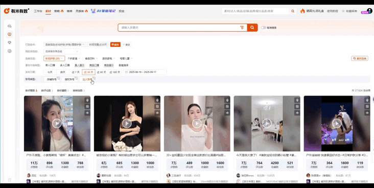 在有米有数平台上,进入「种草&带货」板块,搜索你对标的品牌,筛选“达人账号”,记得“按点赞数”降序,同行合作过的达人内容质量一目了然。