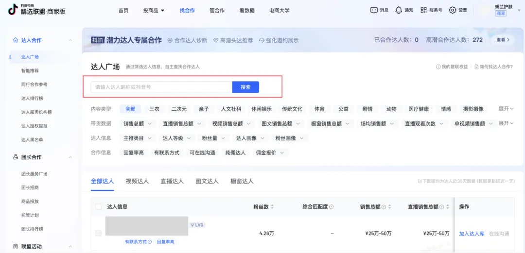 通过抖店精选联盟的「达人广场」来筛选近期有带货记录的达人,也可以看同行合作过的达人。