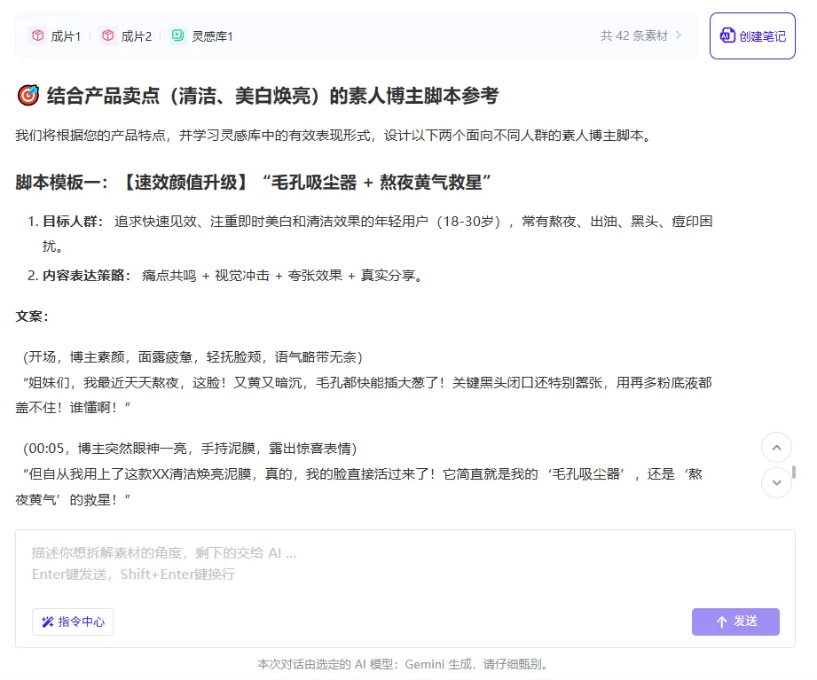 帮我拆解灵感库素材里卖点的表现形式;参考这批素材,结合我 [产品清洁和美白焕亮] 的卖点,输出面向不同人群的脚本参考(包括文案和画面),适用于素人博主分享产品体验的场景,时长30秒左右。